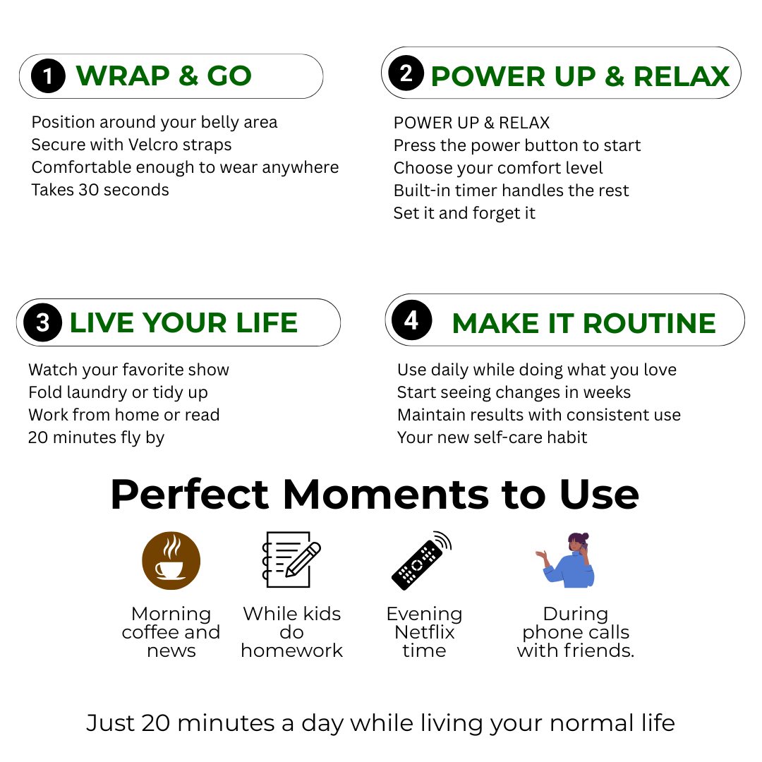 Using clinical-grade red (660nm) and near-infrared (850nm) wavelengths, the EssentiA™ Red Light Therapy Wrap penetrates deep into the skin and stimulates the mitochondria — your body’s natural energy engines. This process increases cellular energy (ATP), activates fat metabolism, and helps release stored fat so your body can burn it naturally, even while you rest.